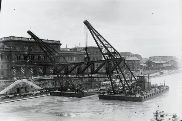 A Szabadság híd elemét beemeli az Ady Endre (1946) és a József Attila (1945) úszódaru, háttérben a Fővámpalota (ma Corvinus Egyetem) és a közraktárak. Leltári jelzet: MMKM TFGY 2017.1.1106. Forrás: Fortepan / Magyar Műszaki és Közlekedési Múzeum / Történeti Fényképek Gyűjteménye / Ganz gyűjtemény
