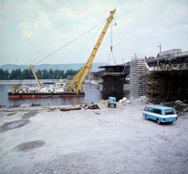 A Clark Ádám úszódaru az Árpád híd szélesítési munkálatainál a pesti hídfő közelében. 1981. Forrás: Fortepan / UVATERV