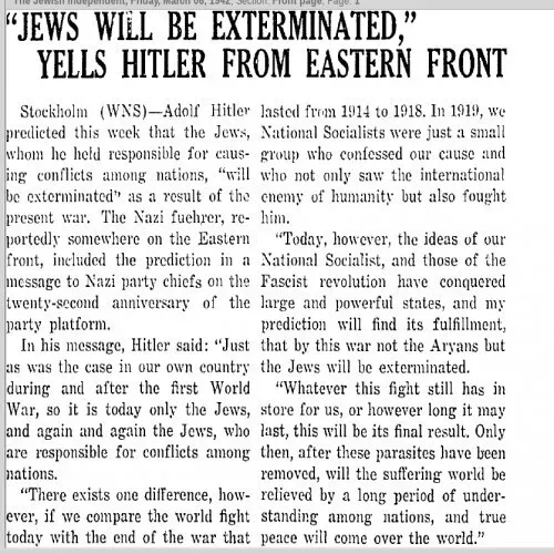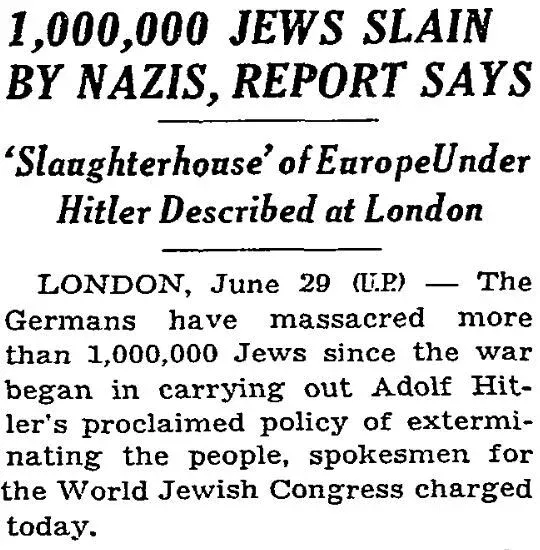 Általános tévhit, hogy az európai zsidóság elpusztításáról csak a „zsidókérdés végső megoldásáról” döntő, 1942 januárjában megrendezett wannseei konferencia után esett szó a közbeszédben. Ezzel szemben a nyugtalanító valóság az, hogy a Houston Post már 1938 novemberében címlapon lehozta, hogy a nácik a teljes megsemmisítéssel fenyegetik a zsidó lakosságot, a Washington Post pedig 1941. június 8-án írt arról, hogy a „nácik mesterterve a legyőzött lengyelek rabszolgasorba taszításával a fajuk teljes megsemmisítése”.