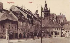 Fotó: Segesvár 1907-ben. A fotón a mai Hermann Oberth tér látható, balra a nevezetes Óratoronnyal.